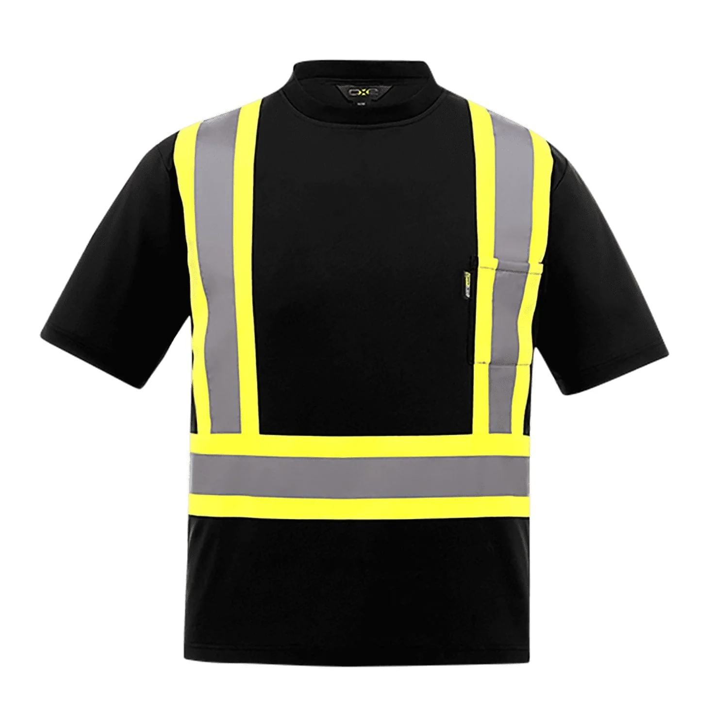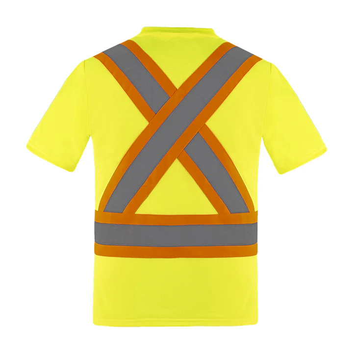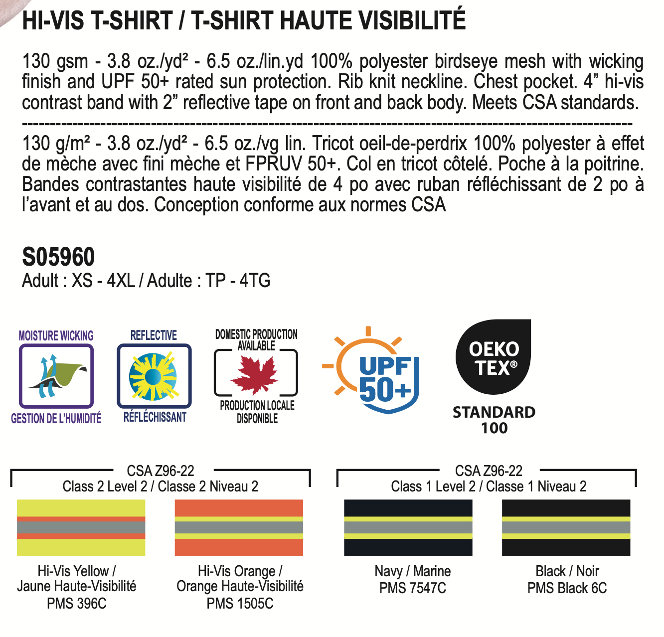 130 gsm – 3.8 oz./yd2 – 6.5 oz./lin. yd 100% polyester birdseye mesh with wicking finish. Chest pocket. 4” hi-vis contrast band with 2” reflective tape on front and back body. Meets CSA standards.