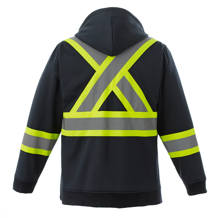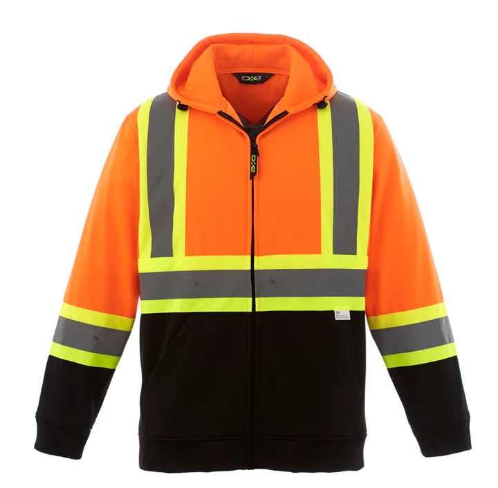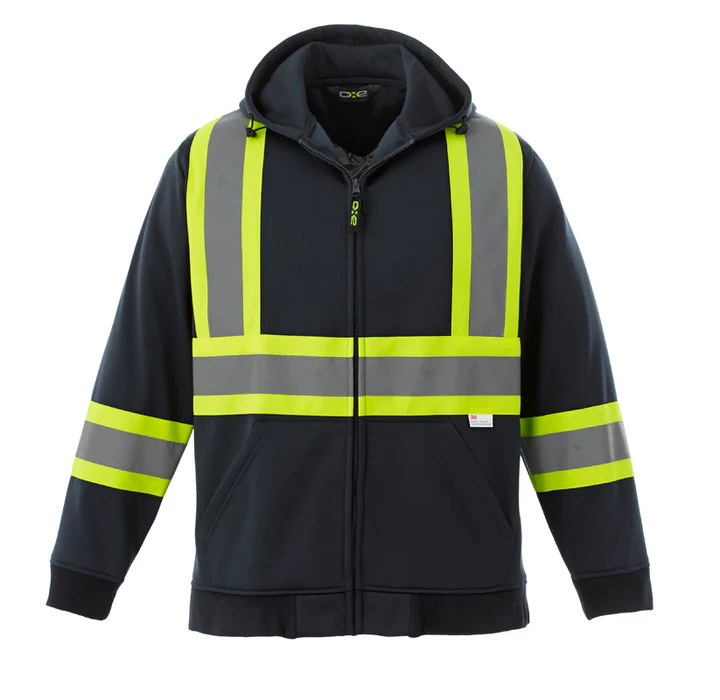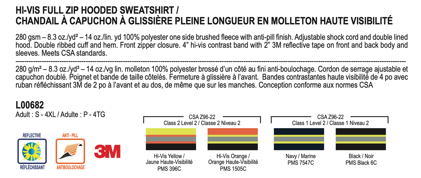 280 gsm – 8.3 oz./yd2 – 14 oz./lin. yd 100% polyester one side brushed fleece with anti-pill finish. Adjustable shock cord and double lined hood. Double ribbed cuff and hem. Front zipper closure. 4” hi-vis contrast band with 2” 3M reflective tape on front and back body and sleeves. Meets CSA standards.
