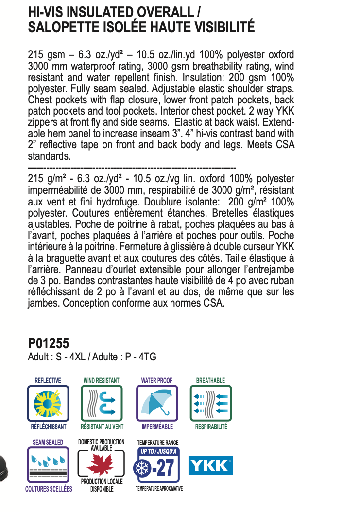 215 gsm – 6.3 oz./yd2 – 10.5 oz./lin. yd 100% polyester oxford 3000 mm waterproof rating, 3000 gsm breathability rating, wind resistant and water repellent finish. Insulation: 200 gsm 100% polyester. Fully seam sealed. Adjustable elastic shoulder straps. Chest pockets with flap closure, lower front patch pockets, back patch pockets and tool pockets. Interior chest pocket. 2 way YKK zippers at front fly and side seams. Elastic at back waist. Extendable hem panel to increase inseam 3”. 4” hi-vis contrast band with 2” reflective tape on front and back body and legs. Meets CSA standards.