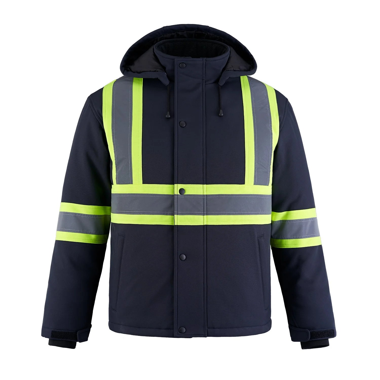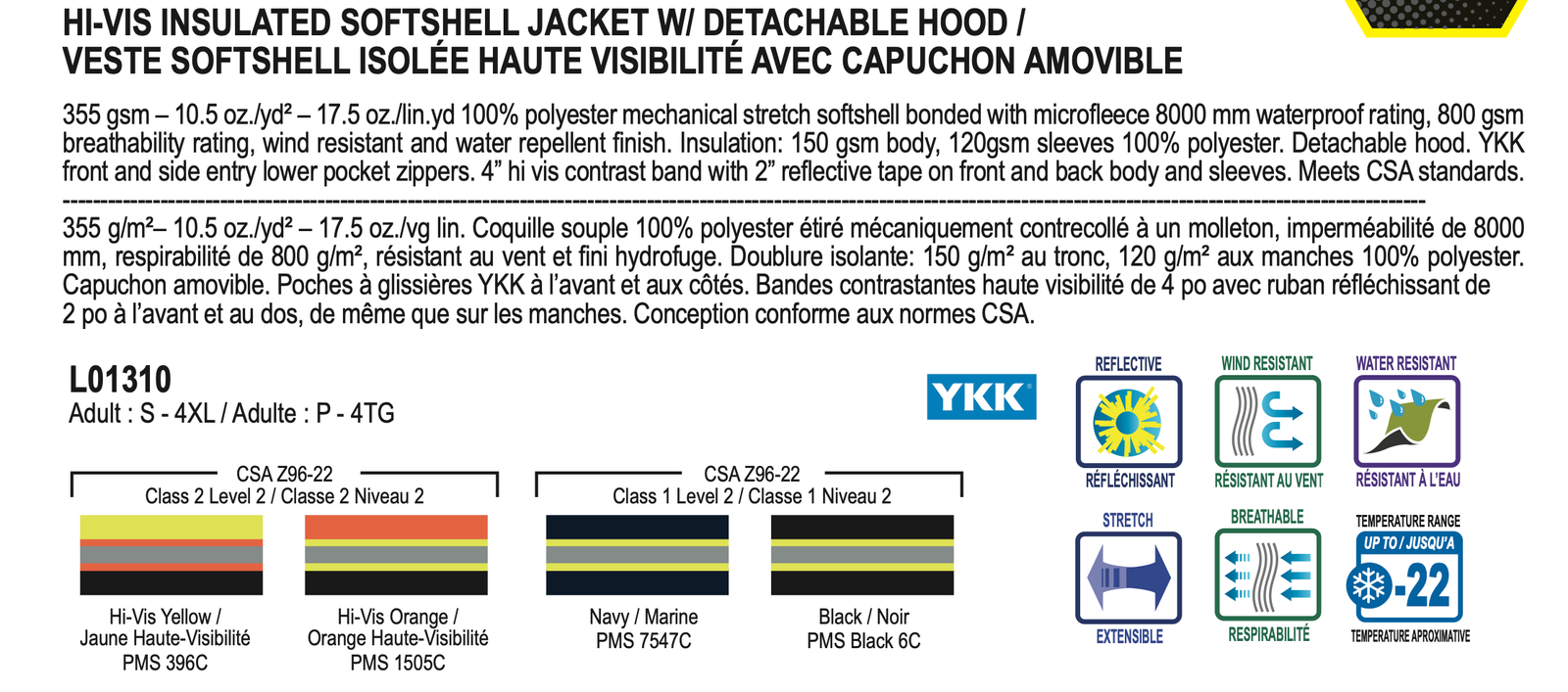355 gsm – 10.5 oz./yd2 – 17.5 oz./lin. yd 100% polyester mechanical stretch softshell bonded with microfleece 8000 mm waterproof rating, 800 gsm breathability rating, wind resistant and water repellent finish. Insulation: 150 gsm body, 120gsm sleeves 100% polyester. Detachable hood. YKK front and side entry lower pocket zippers. 4” hi vis contrast band with 2” reflective tape on front and back body and sleeves. Meets CSA standards.