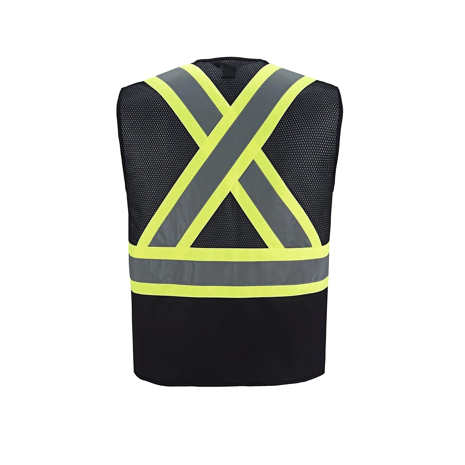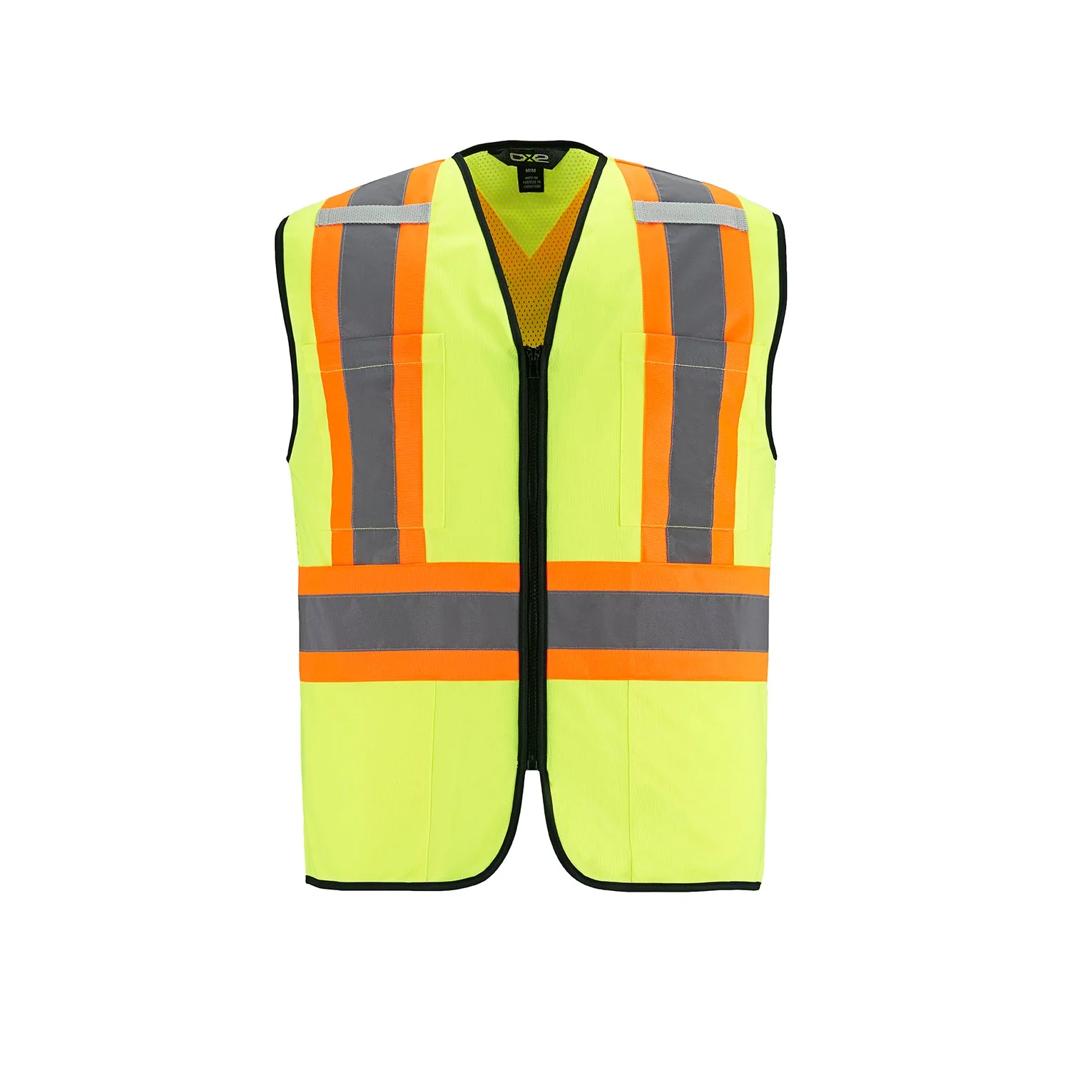 130 gsm – 3.8oz/yd2 – 6.5oz/lin yd. 100% polyester tricot knit. Mesh panel on back upper body for added ventilation. 4 front storage pockets, radio clip strap on front shoulders. YKK zipper closure. Durable binding. 4″ contrast hi-vis tape with 2″ reflective tape on front and back body. Meets CSA standards.