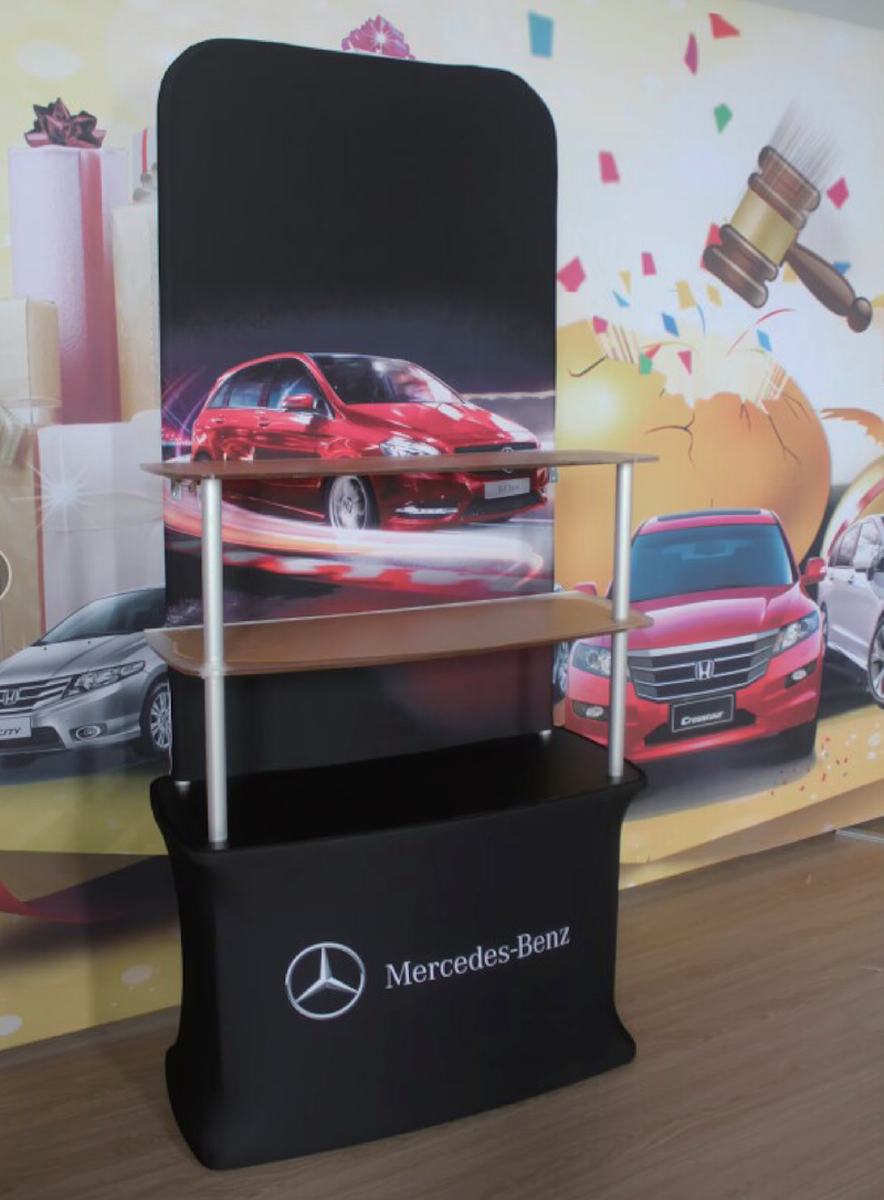 This premium fabric backwall display rack kit from Outlet Tags Canopies features a lightweight aluminum tubular frame, ensuring durability and ease of assembly. The kit includes two full-color printed graphics, one for the striking back wall and one for the sturdy base, both offering high-resolution imagery to enhance your brand presence. It also comes with two functional racks and a convenient carrying bag for effortless transport. The compact and portable design ensures hassle-free setup and mobility, making it ideal for trade shows, exhibitions, and promotional events. The integrated shelves provide an excellent platform for showcasing your products, while the vibrant fabric backwall and base counter effectively communicate your marketing message and boost brand visibility.